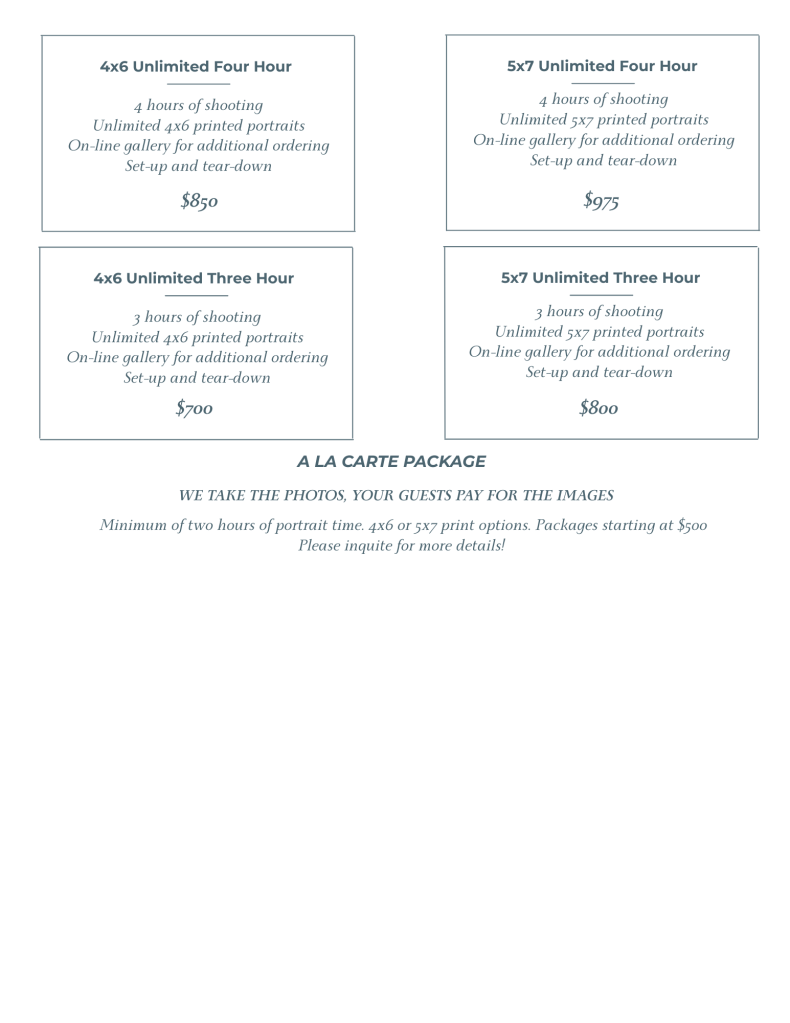 Imagine your guests walking away with a tangible memory in hand! This is not your typical iPad Photo Booth, a professional photographer is present taking high resolution portraits of your guests. Our professional dye-sublimation printer creates stunning 4×6 inch photos in a lightning-fast 8 seconds, and we can also provide 5×7 prints. For an extra touch of sophistication that truly impresses, consider adding classic paper folios-they beautifully frame each photo.